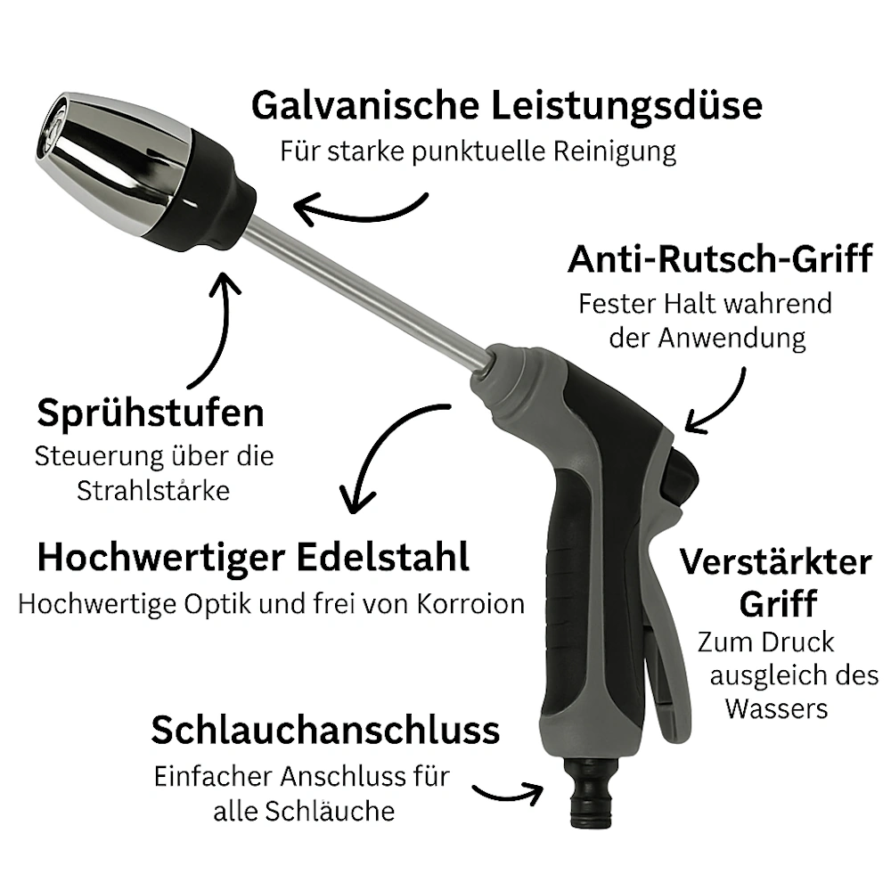 Brauchen Sie eine praktische und kostengünstige Möglichkeit, Ihre Außenbereiche zu reinigen – ohne schweres, teures Gerät? Sind Sie es leid, stundenlang Schmutz und Flecken wegzuschrubben? Jetzt gibt es eine Lösung, die Ihren Gartenschlauch in ein kraftvolles Reinigungswerkzeug verwandelt – mit dem Druck und der Präzision, die Sie brauchen, um selbst hartnäckigste Verschmutzungen zu beseitigen. Dieses innovative Gerät ist leicht anzubringen, äußerst mobil und ideal für verschiedenste Reinigungsaufgaben – vom Autowaschen bis zur Terrassenpflege. Es wird ganz ohne Strom betrieben, spart also Energiekosten und liefert dennoch hervorragende Ergebnisse. Es ist langlebig, effektiv und wurde entwickelt, um die Reinigung effizienter zu gestalten – bei gleichzeitig reduziertem Wasserverbrauch. Perfekt für alle, die erstklassige Reinigung mit minimalem Aufwand und maximaler Ersparnis wollen.